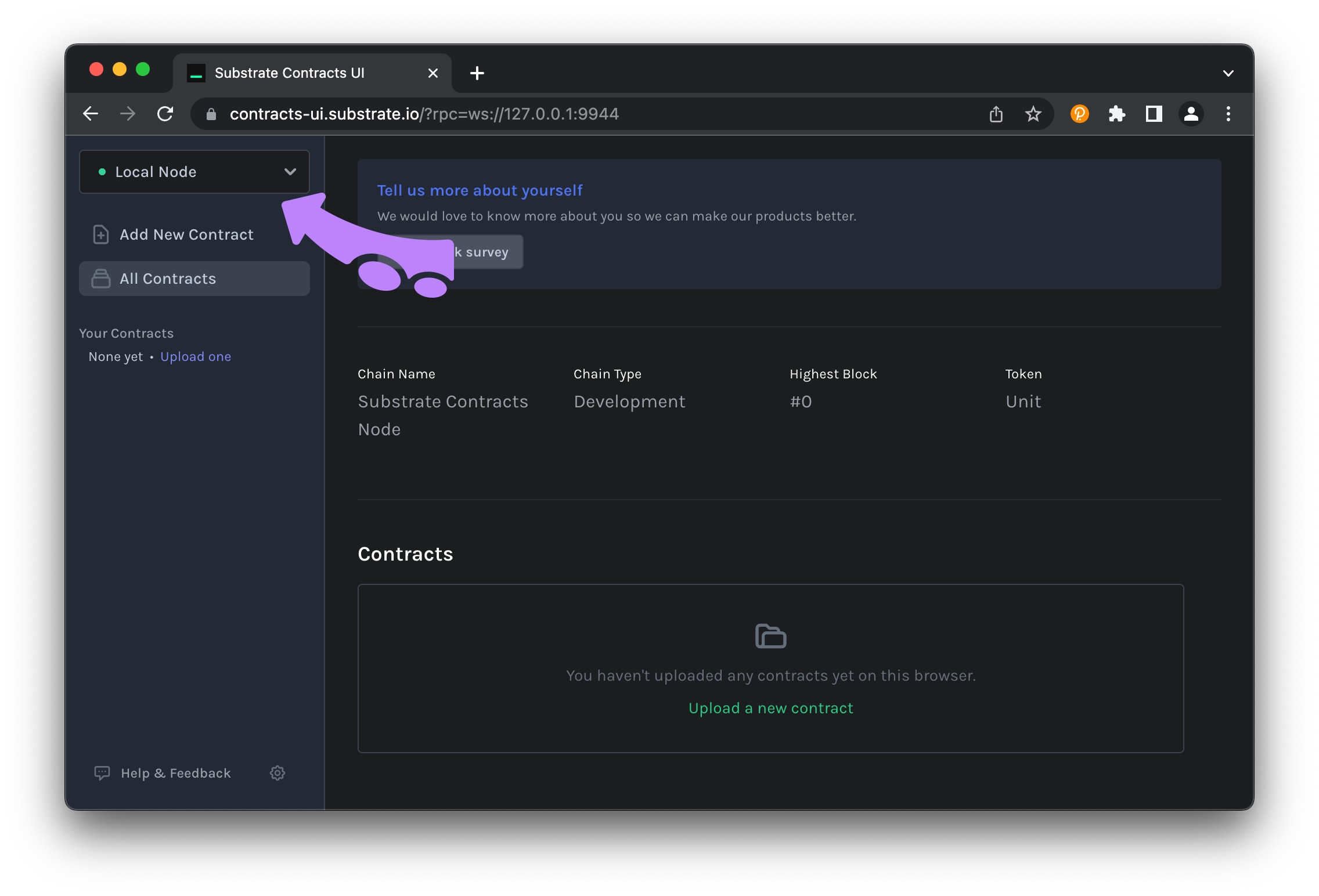 Você pode interagir com seu nó usando a interface do Contratos. Assim que tiver a página da web aberta, você precisará configurar a interface para se conectar ao nó em execução localmente: