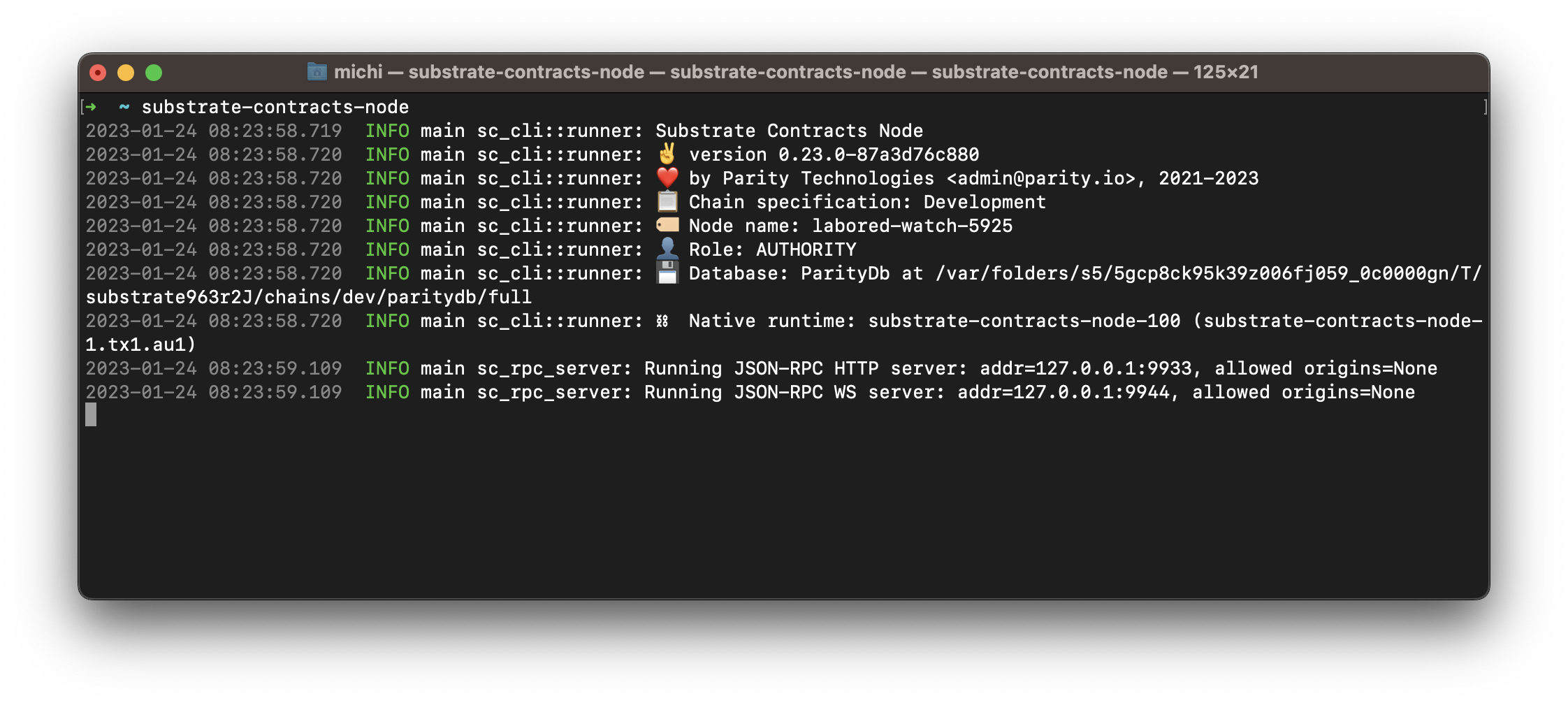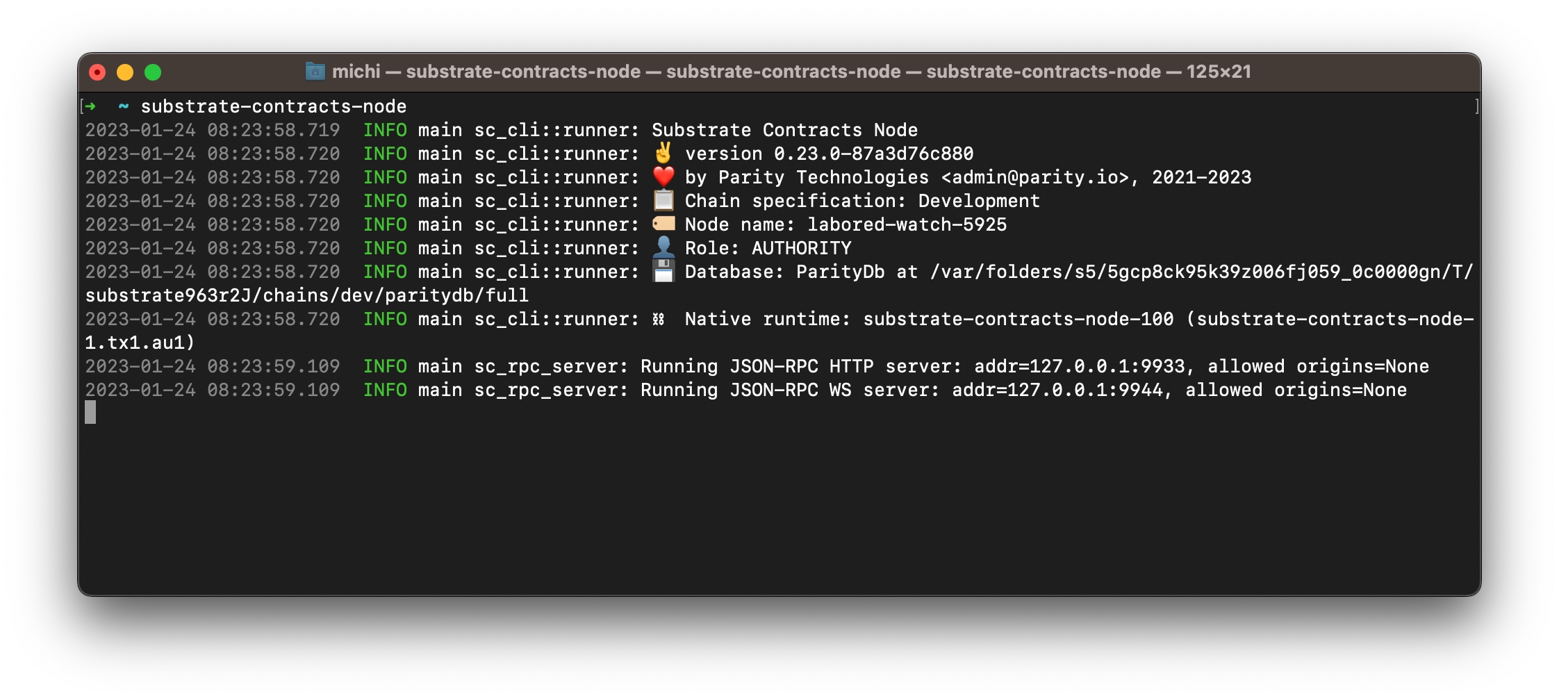 Após instalar com sucesso o substrate-contracts-node, você pode iniciar uma cadeia de desenvolvimento local executando: