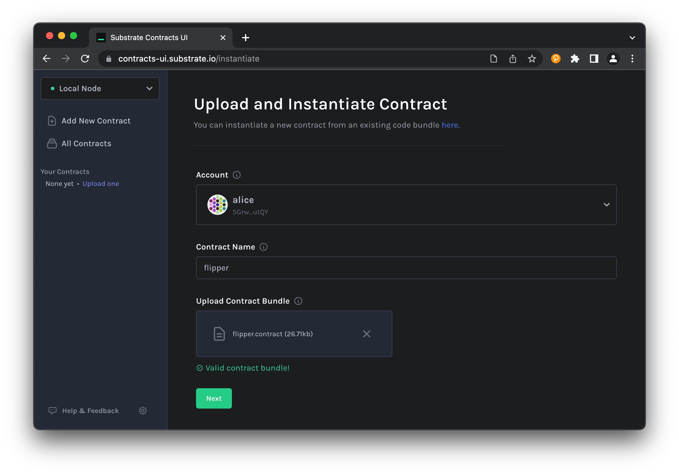 flipper.contractque contém o pacote Wasm e metadados para a área de arrastar e soltar. Você verá a interface do usuário analisar os metadados e habilitar o botão que o levará para a próxima etapa.Clique no botão Next.