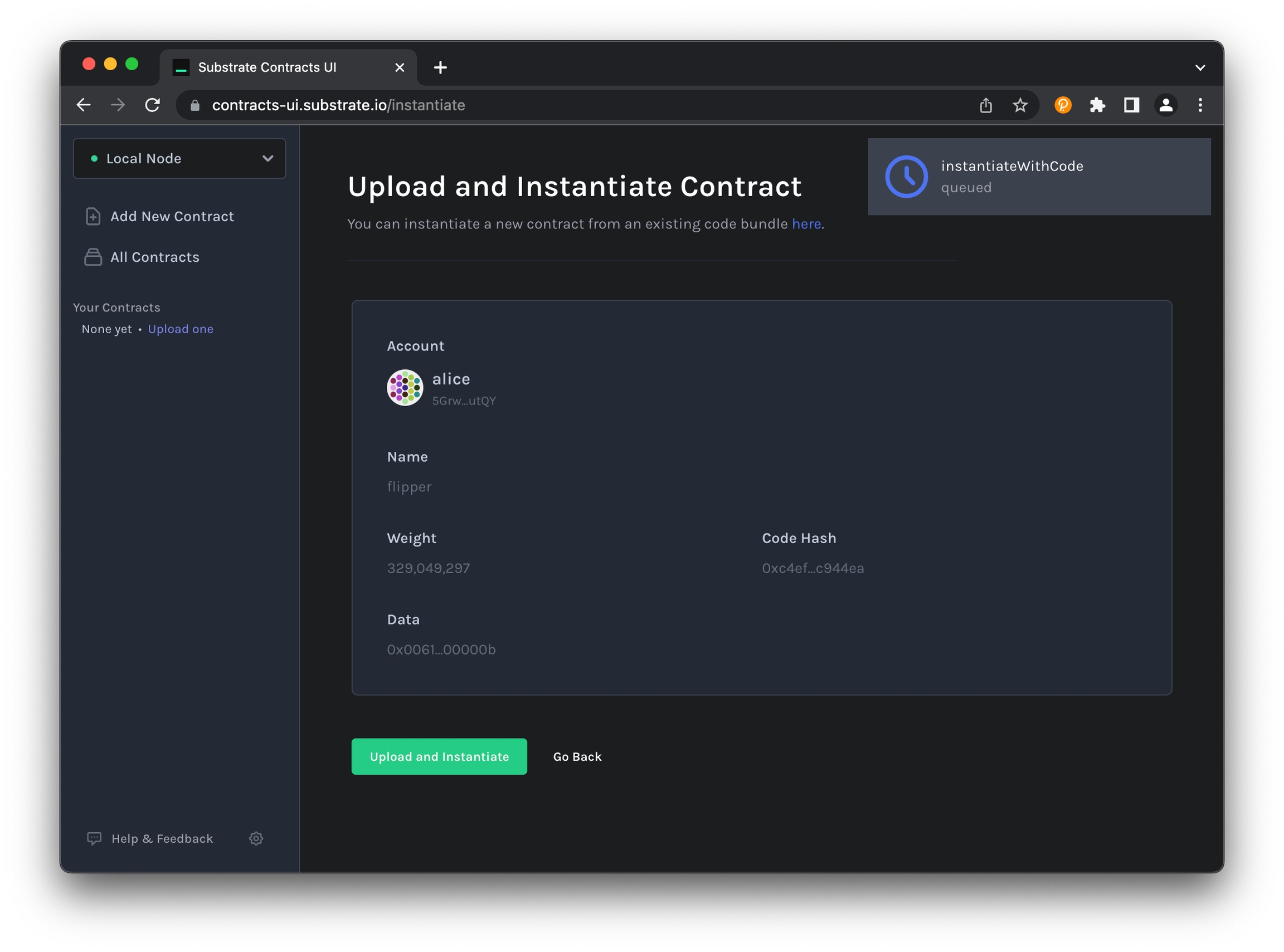 A transação está agora em fila, revise seus dados e clique em Upload and Instantiate ou volte e modifique suas entradas.