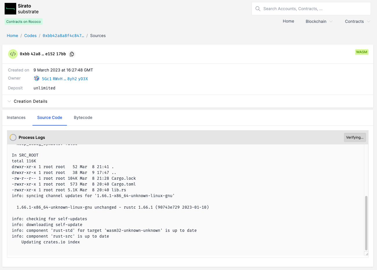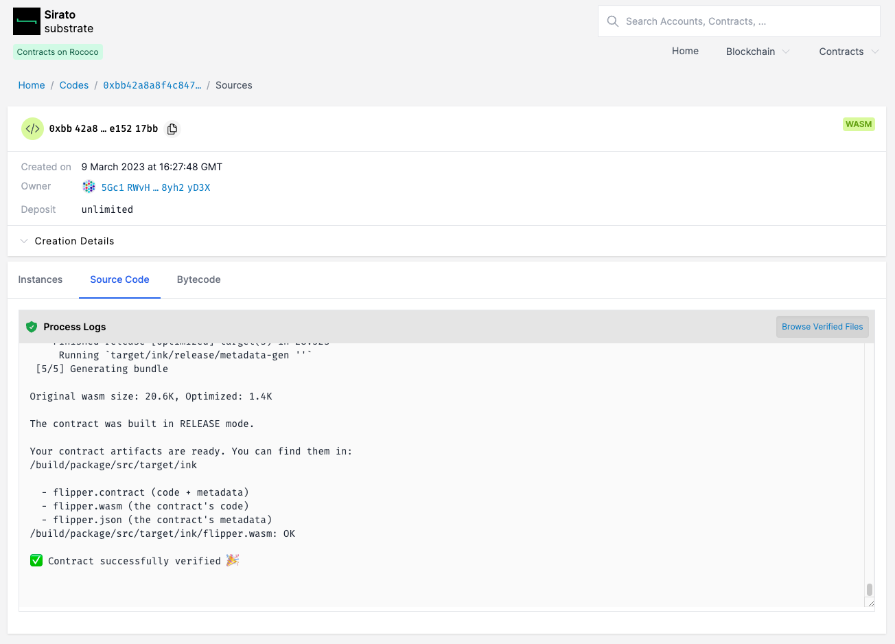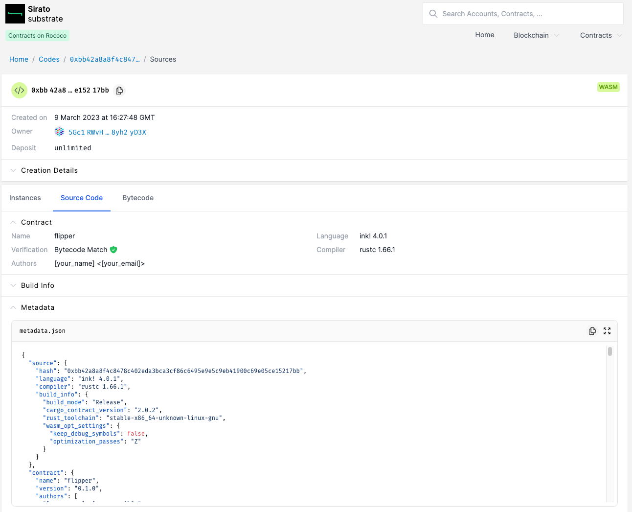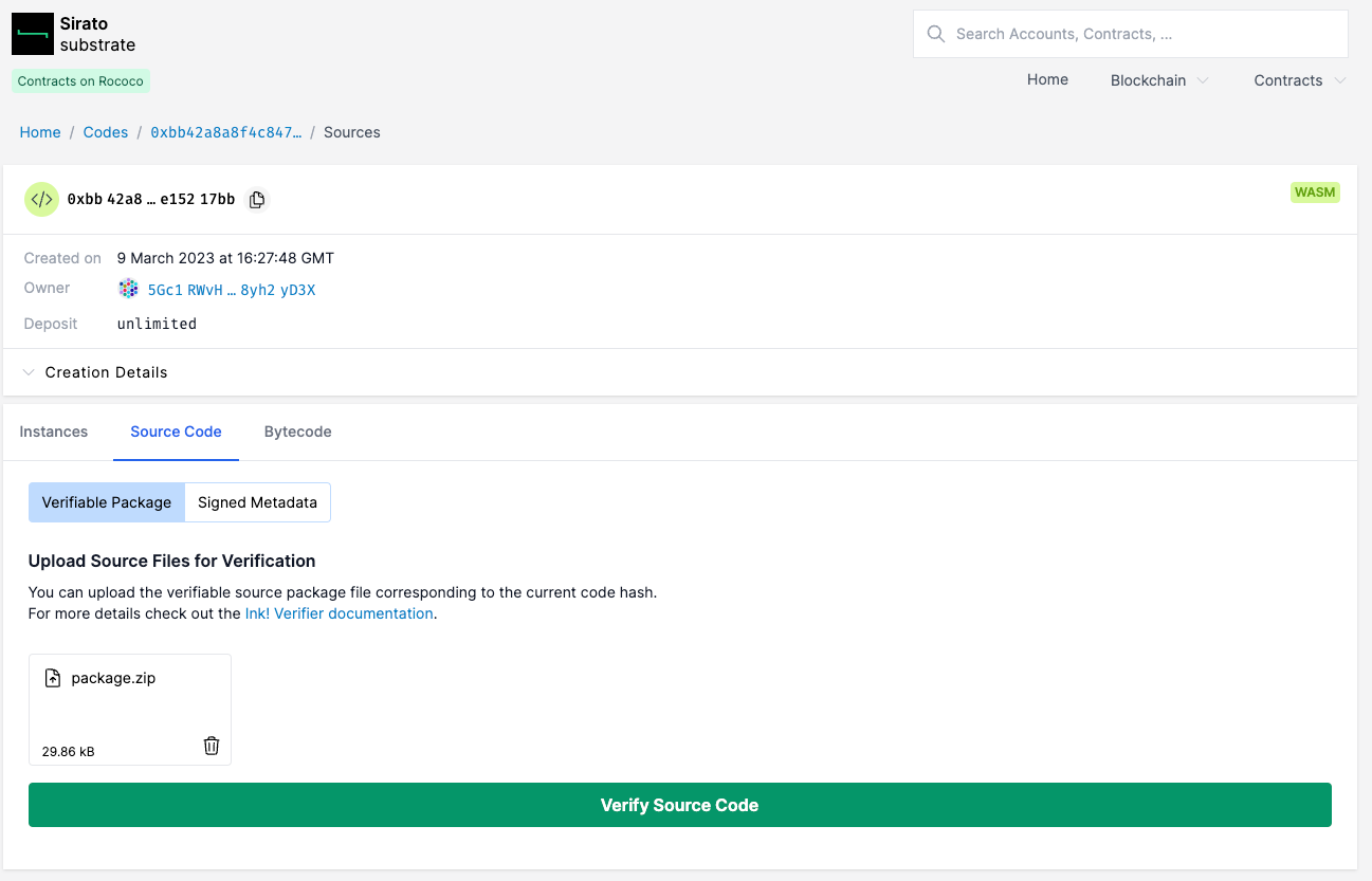 Por exemplo, para verificar um contrato implantado na parachain Rococo, você pode acessar a instância do Sirato em substrate.sirato.xyz.