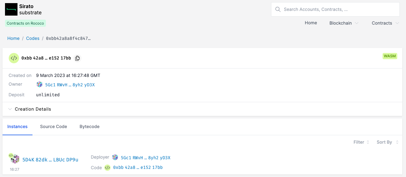 Alternativamente, você pode navegar diretamente digitando a URL https://substrate.sirato.xyz/codes/0x<code-hash>.