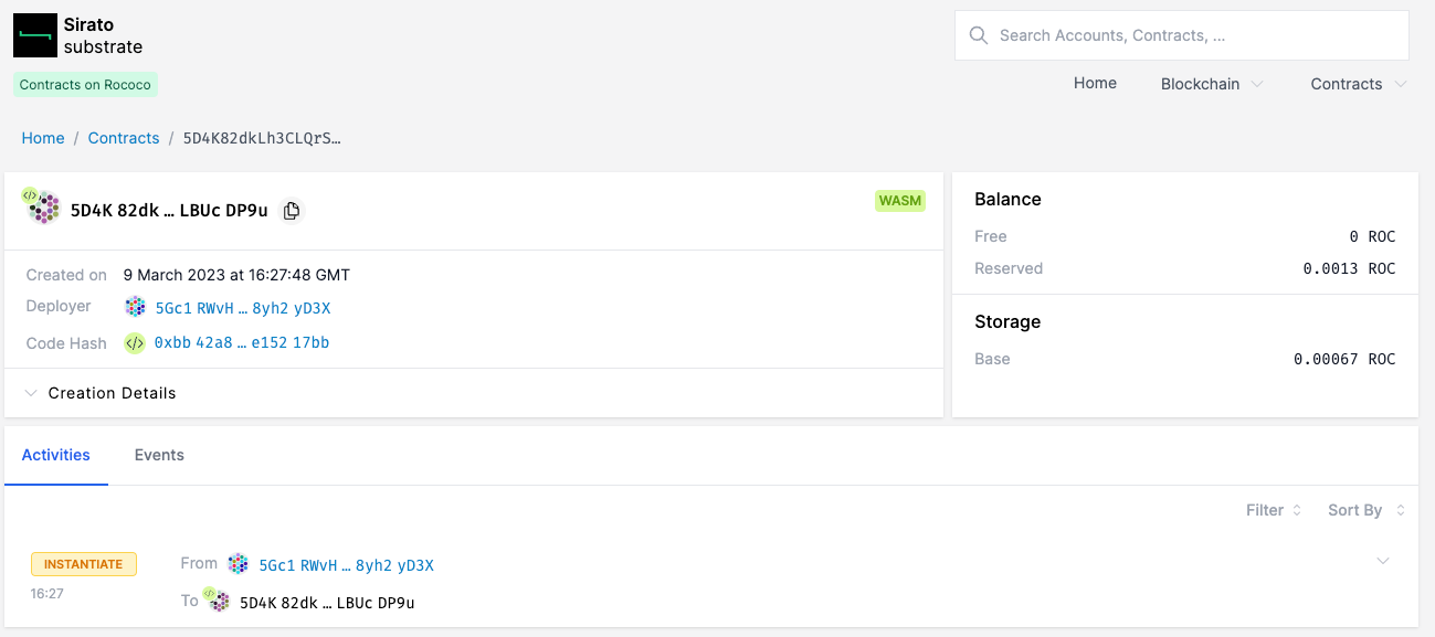 A partir daí, você pode navegar até o código implantado clicando na referência do código que corresponde ao código hash retornado pela chamada de instanciação do contrato do cargo contract.