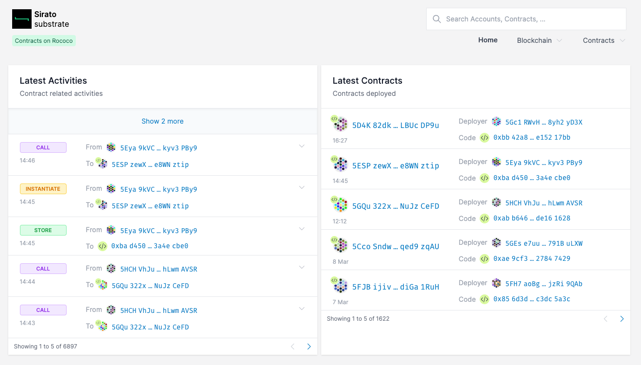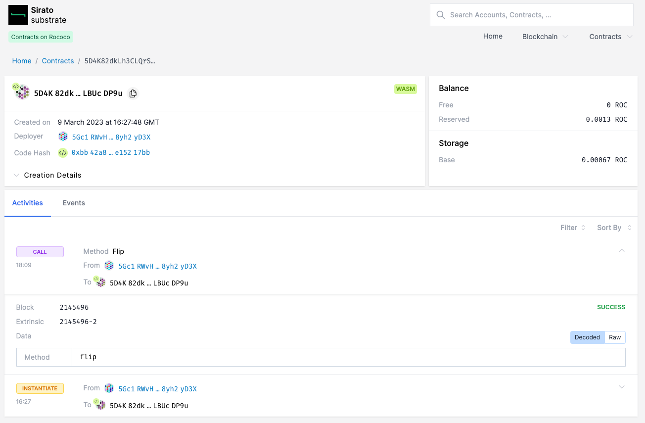 Além disso, uma vez que um contrato tenha sido verificado, os detalhes de qualquer atividade do contrato e eventos que ocorram em uma parachain ou cadeia Substrate são decodificados para o usuário no Sirato.