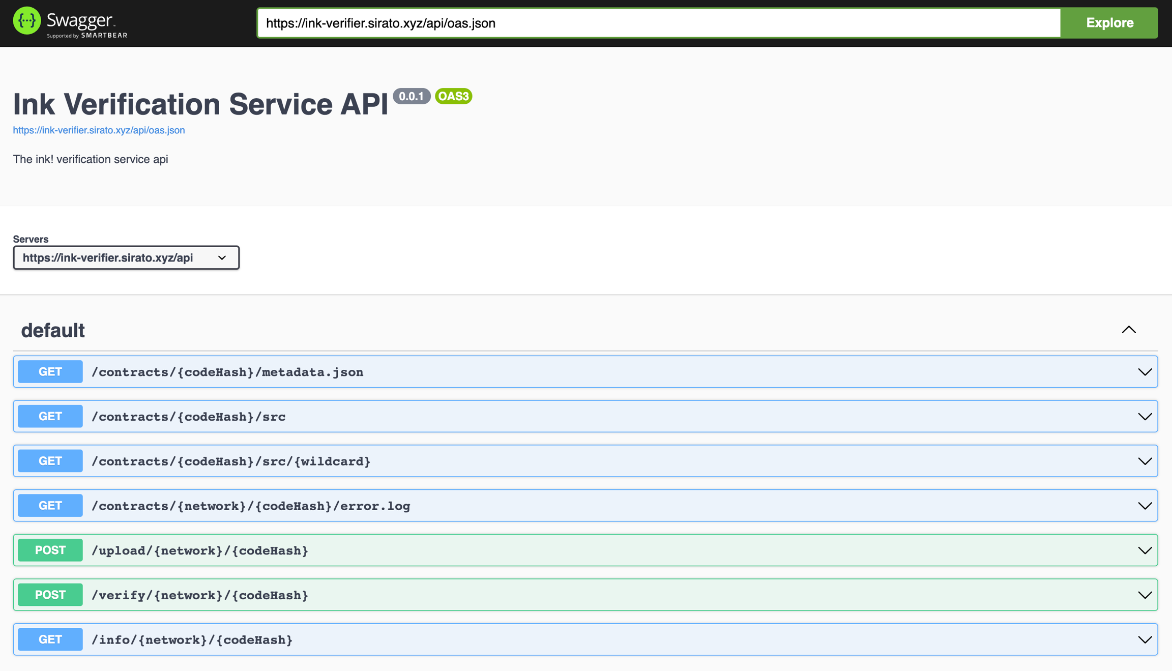 A Web3 Labs hospeda uma instância pública do serviço em ink-verifier.sirato.xyz. Uma interface Swagger para o serviço também está disponível em ink-verifier.sirato.xyz/api/api-docs/.
